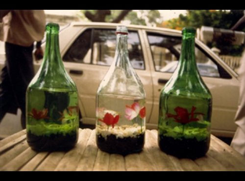 Tous les matins, Amadou se rend à Hann dans les jardins du parc zoologique près de Dakar, où il pêche des petits poissons dans les lacs qui servent à l’irrigation des potagers. Il les introduit ensuite dans des bouteilles ou des dames-jeannes de récupération qu’il agrémente de coquillages ou d’algues ramassés sur la plage pour en faire des aquariums.