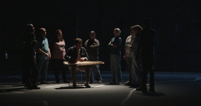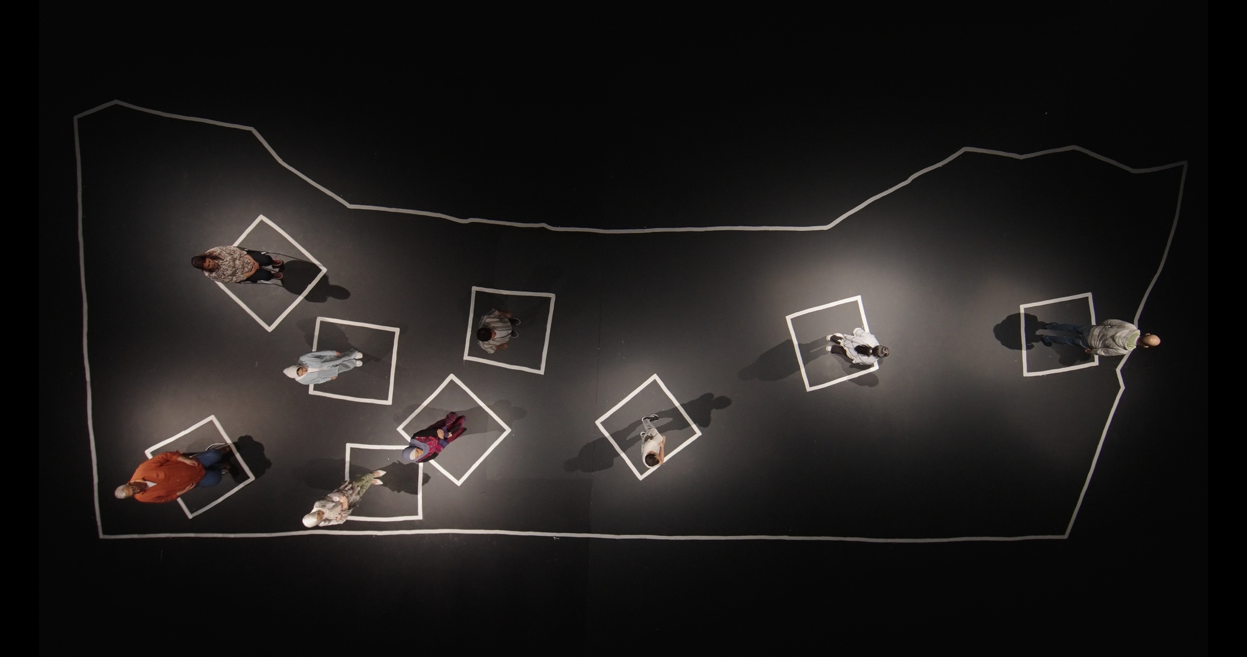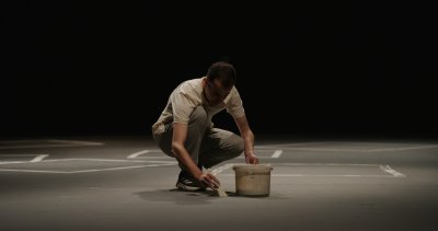 A map of Gaza, its cities, camps and neighbourhoods. White paint on a black floor. In the roughly drawn outlines, nine refugees who were able to escape hell tell their stories. Their previous lives, their buried dreams, the danger, the rubble, the loss of dear ones. Oppressed, hindered existences, but not yet reduced to ashes, not yet totally plunged into oblivion and darkness. By sharing their stories, the protagonists of Who Is Still Alive attempt to reconnect with themselves, to stop being ghosts. To come back, perhaps, to life.