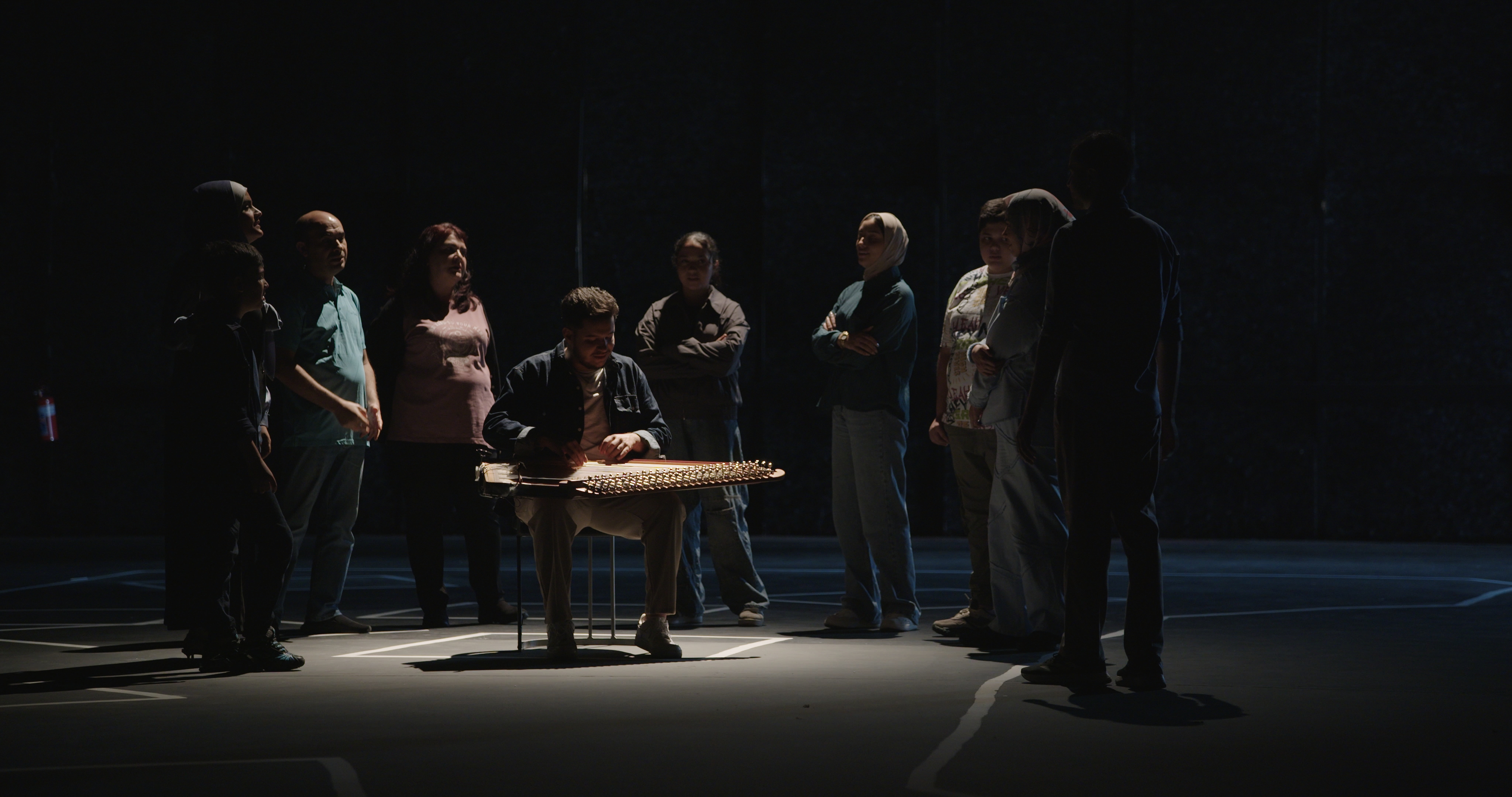 Une carte de Gaza, ses villes, camps et quartiers. Peinture blanche sur un sol noir. Dans les contours tracés sommairement, neuf réfugiés qui ont pu échapper à l’enfer, racontent. Leurs vies d’avant, la perte des êtres chers. Des existences oppressées, mais pas encore réduites en cendres. En partageant leurs récits, les protagonistes tentent de se reconnecter à eux-mêmes, de cesser d’être des fantômes. De revenir, peut-être, à la vie.