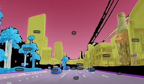 Le premier geste de Their Eyes serait de reconfigurer un paysage : chacune de ses images, décomposées selon des zones de métadonnées minimalistes (“human”, “building”, …), raconte la transformation de notre réel vers un regard de machine. Notre point de vue, c’est celui de ces voitures autonomes qui peuplent de plus en plus nos villes, et de l’histoire sociale de leur technologie. Derrière ces tableaux stupéfiants de décors urbains simplifiés pour l’IA, un travail d’objectivisation du réel réalisé par des travailleur·euses basé·es aux quatre coins du Sud Global pour entraîner ces voitures à lire le paysage de nos villes du Nord, pour différencier un humain d’un arbre, une rue d’un passage piétons, matérialisant soudainement une “géopolitique du trottoir” calquant celle des distinctions sociales. Dans Their Eyes, leurs voix mais pas leurs visages pour faire le récit d’une modernité post-humaine. Dans ce monde où les corps deviennent pixels, puis tracés, que sommes nous aux yeux d’une caméra autonome, sinon une donnée qui ne fait plus de différence entre ciel, poubelle et humain ? - Vivien Ghiron